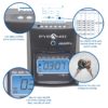 • Displays time, date and day of week on easy-to-read, back-lit LCD screen