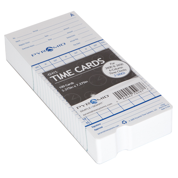 Two-sided time cards for Pyramid 2500, 2500k1, 2600, 2650, 2650Pro, 6200 and ,6400 Time Clocks. Side A includes days 1-15; Side B includes days 16-31. Data fields include Number, Period, Name, Regular Hours, Rate, Amount, Overtime Hours, Rate, Amount, Deductions, Actual Pay, Pay Date, Employee Signature, Supervisor Approval and six columns for three IN/OUT Punch cycles with Total Column. Notched bottom design enables time clock to detect correct side of time card.Heavy duty card stock.100/pk. Printed in USA.