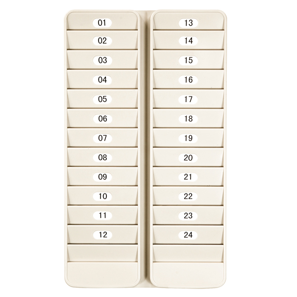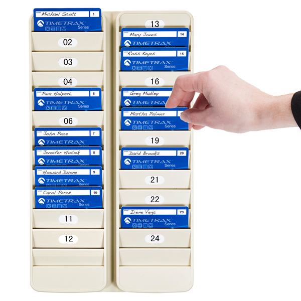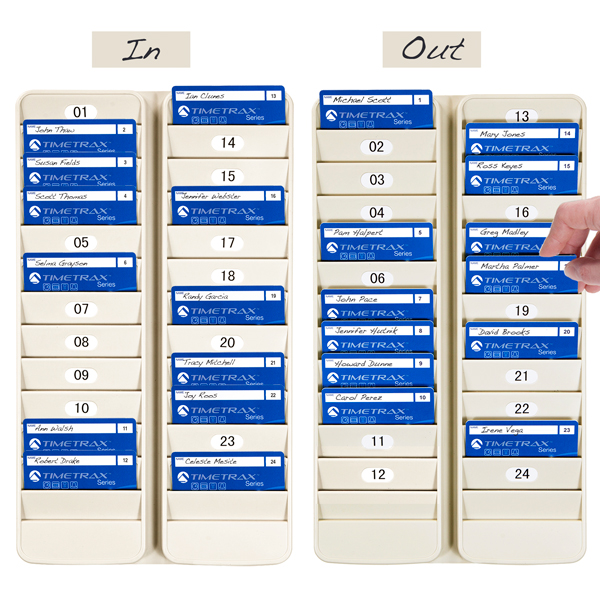 The 500-24 employee badge rack keeps swipe cards, badges and other items readily accessible. Install next to time clocks or in entry areas. Holds 24 standard size employee ID cards, swipe cards and proximity badges. Install two racks side by side to visually monitor employee In/Out attendance. Includes self-adhesive number labels for assigning card slots to employees. Lightweight, durable plastic. Putty.